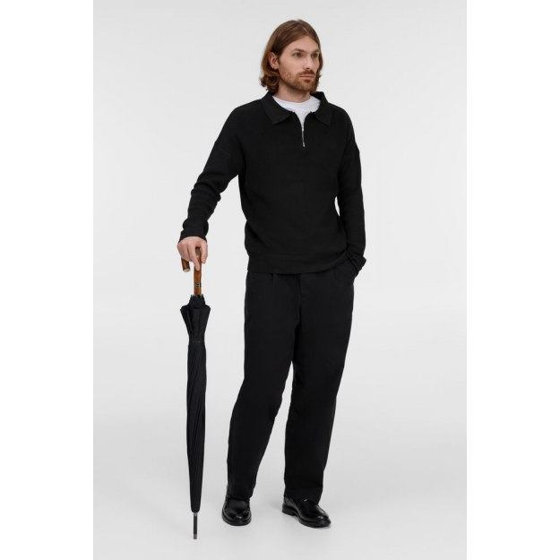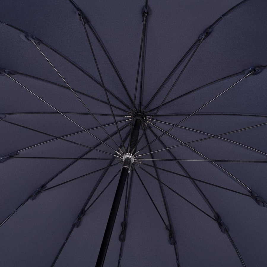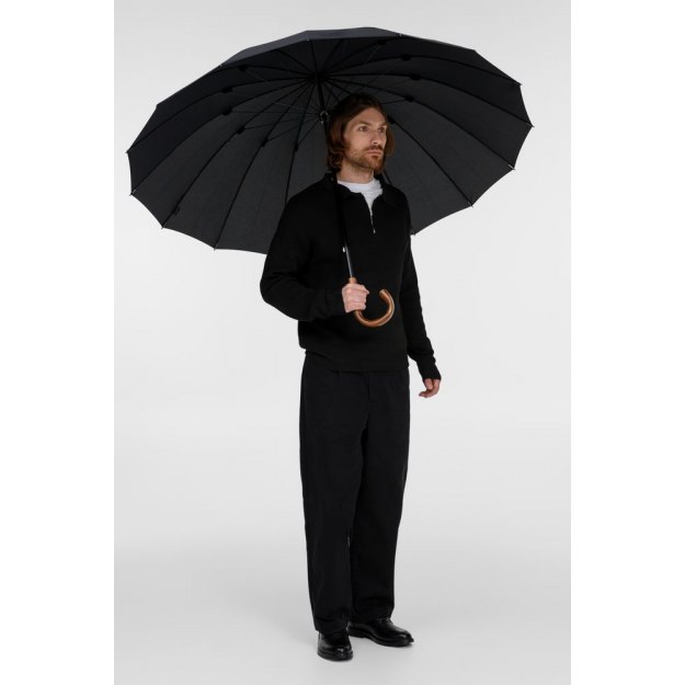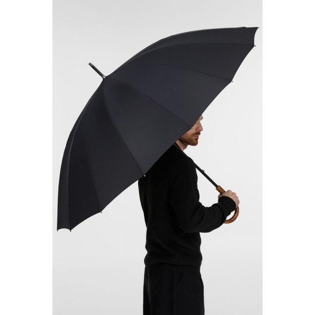 Солидный изысканный зонт с ручкой из дерева и 16 спицами. Большой купол легко укроет от дождя сразу двоих, а надежная конструкция выдержит даже сильный ветер.