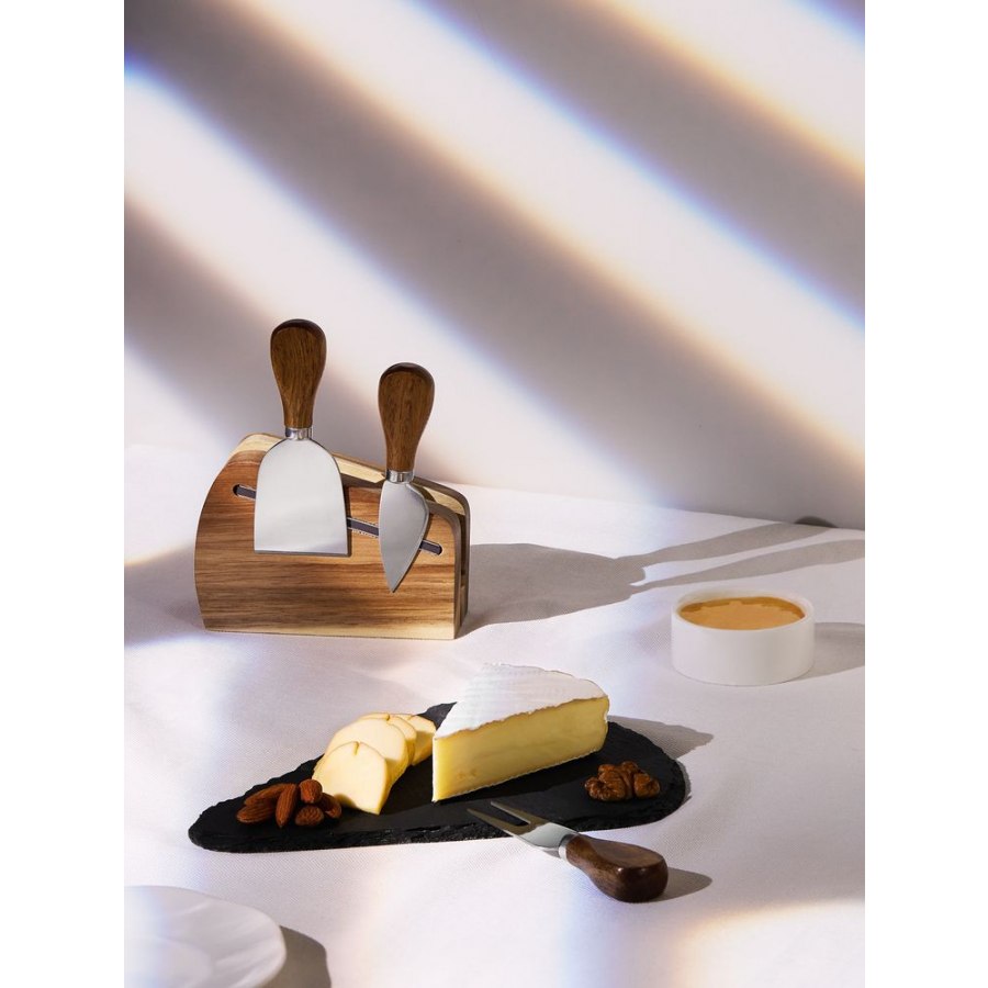 Подставка и рукоятки ножей выполнены из дерева акации, лезвия — из высококачественной нержавеющей стали.