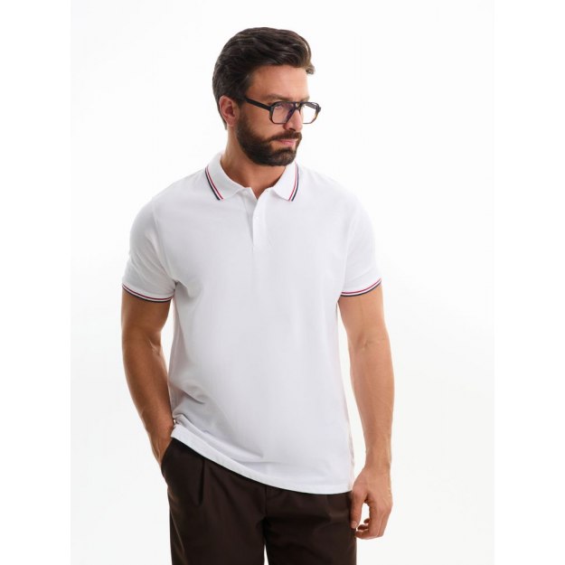 Мужская рубашка поло с боковыми швами. Планка с 2 пуговицами. Воротник и нижний край рукавов в резинку 1х1. Плетеная укрепляющая тесьма по вороту.