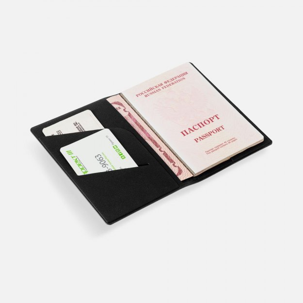 Обложка из искусственного материала, имитирующего сафьяновую кожу, с дополнительными карманами для визиток, полиса ОМС или записок.