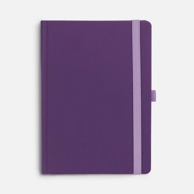 Ежедневник с твердой обложкой без поролона, выполнен из материала Soft Touch, фиолетовый UU, дополнен резинкой шириной 1 см, петлей-резинкой для ручки, капталом и ляссе в цвет обложки.