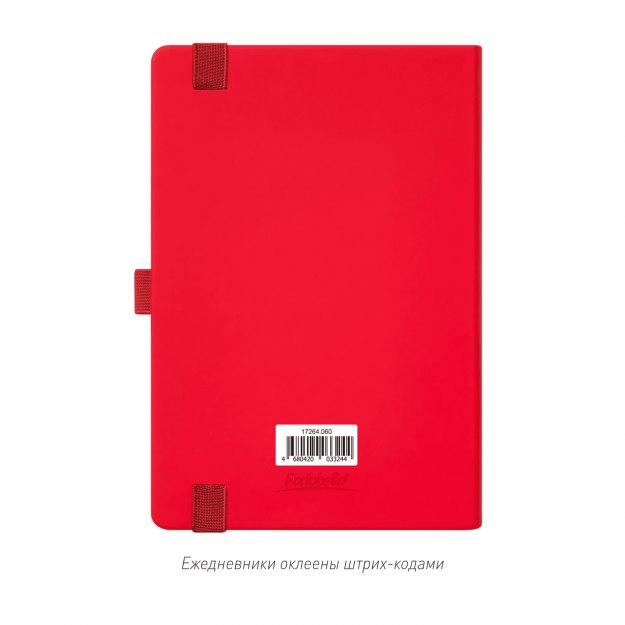 Недатированный ежедневник в ярком, эффектном, комфортном красном цвете. Обложка жесткая, гладкая, матовая, из искусственной кожи, со скругленными уголками. Поверхность переплетного материала – Soft Touch – с легким эффектом пудры, износоустойчивая. Цвет – красный, насыщенный, приятен глазу. Серые матовые форзац и нахзац создают удачное контрастное сочетание с цветом обложки. Страницы теплого приятного светлого-кремового цвета, гладкие, с легкой шелковистостью и со скругленными уголками. Срез матовый, в тон страниц. Ляссе одинарное, атласное, красного цвета, в тон обложки. Тактильно шелковистое, с легким блеском. Вертикальная фиксирующая резинка плотная, надежная, красного цвета в тон обложки. Декорирована прямоугольным фрагментом из материала обложки с прошивкой по периметру в тон. Есть петелька для ручки в тон резинки.Упаковка: пластиковая коробка - есть
