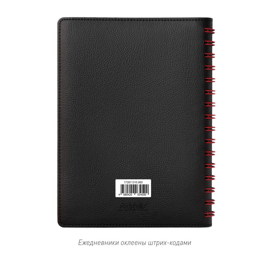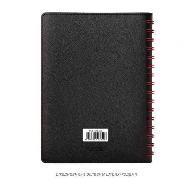 Недатированный ежедневник в гибкой обложке со скругленными уголками из искусственной кожи. Обложка выполнена из сшивки двух материалов. Внешний материал обложки – матовый, с некрупным рельефом под натуральную кожу. Цвет – черный, насыщенный, динамичный, однородный. Внутренний материал обложки – Latte – бархатистый, мелкозернистый, ярко-красного цвета. По периметру обложки выполнена прошивка в тон. Форзац и нахзац контрастные, ярко-красного цвета. Теплые кремовые страницы со скругленными уголками выполнены из гладкого шелковистого офсета. Срез матовый, в тон страниц. Ежедневник надежно скреплен полускрытой пружиной в цвет внутреннего материала обложки. Изделие комплектуется вкладышем с цветными стикерами и индивидуальной упаковкой.Упаковка: пластиковая коробка - есть