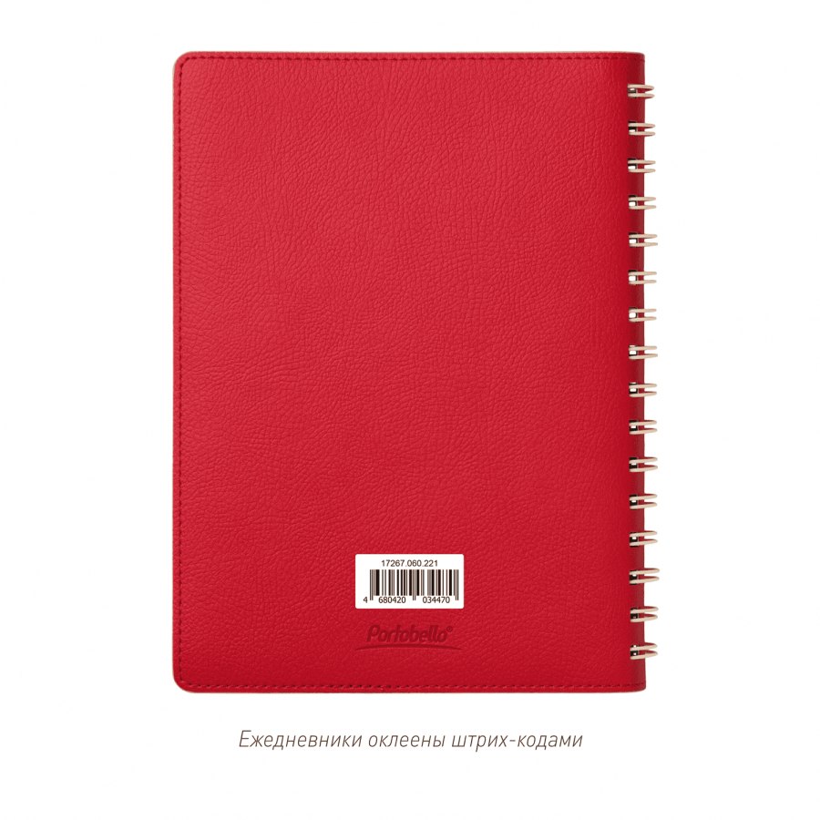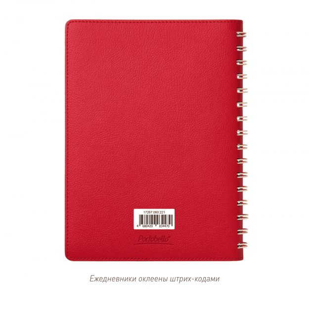 Недатированный ежедневник в гибкой обложке со скругленными уголками из искусственной кожи. Обложка выполнена из сшивки двух материалов. Внешний материал обложки матовый, с некрупным рельефом под натуральную кожу. Цвет – яркий красный, однородный. Внутренний материал обложки – Latte – бархатистый, мелкозернистый, однородного светло-бежевого цвета. По периметру обложки выполнена прошивка в тон. Форзац и нахзац контрастные, бежевые. Теплые кремовые страницы со скругленными уголками выполнены из гладкого шелковистого офсета. Срез матовый, в тон страниц. Ежедневник надежно скреплен полускрытой пружиной в цвет внутреннего материала обложки. Изделие комплектуется вкладышем с цветными стикерами и индивидуальной упаковкой.Упаковка: пластиковая коробка – есть