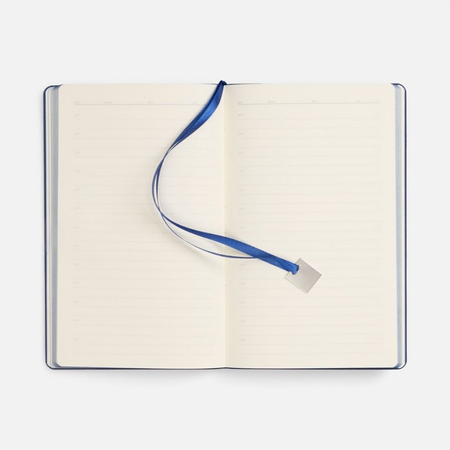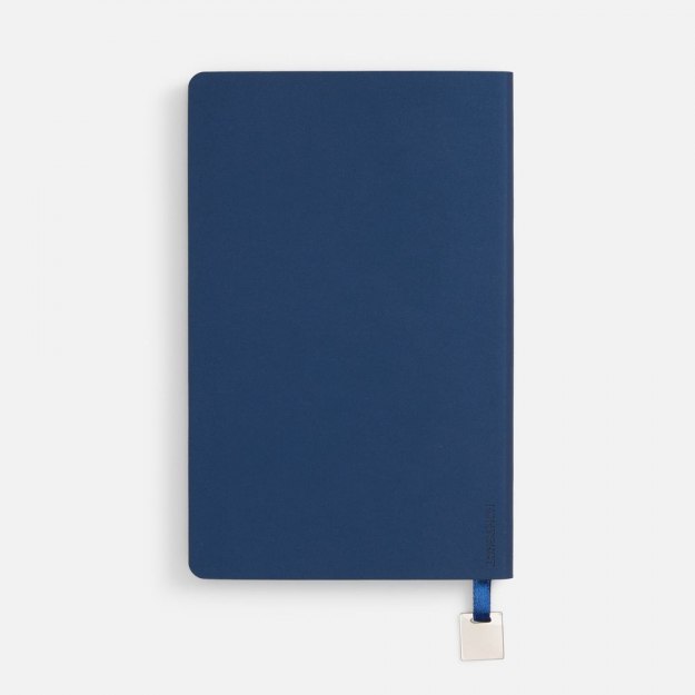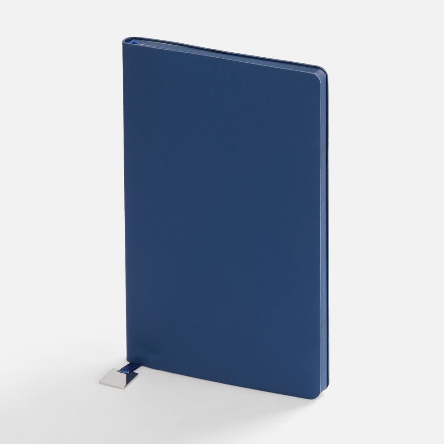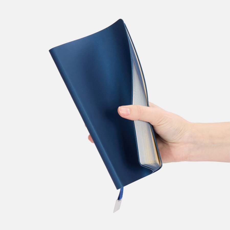Ежедневник с гибкой обложкой, выполнен из материалов Soft Touch Pearl, синий НН, и темно-синего Latte (внутренняя часть обложки), дополнен ляссе в цвет обложки и металлической шильдой..