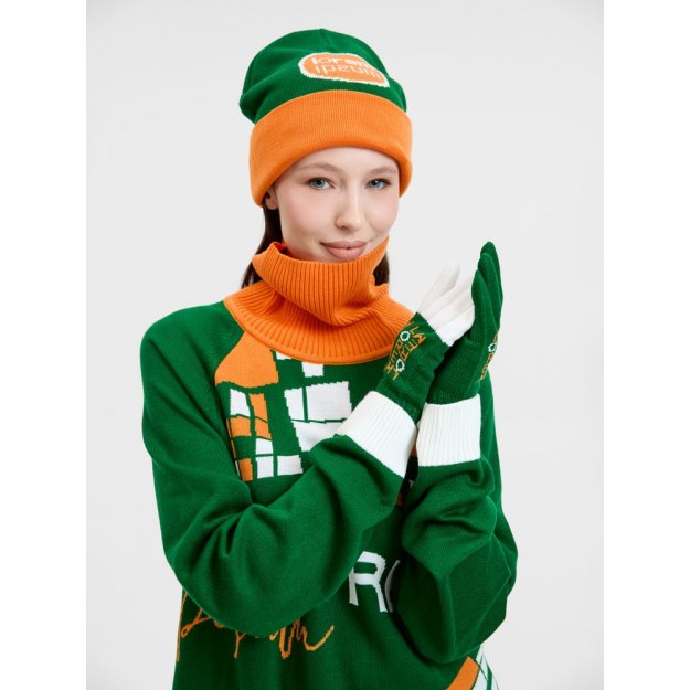 Шапка с вывязанным логотипом и индивидуальным рисунком в фирменной цветовой гамме.