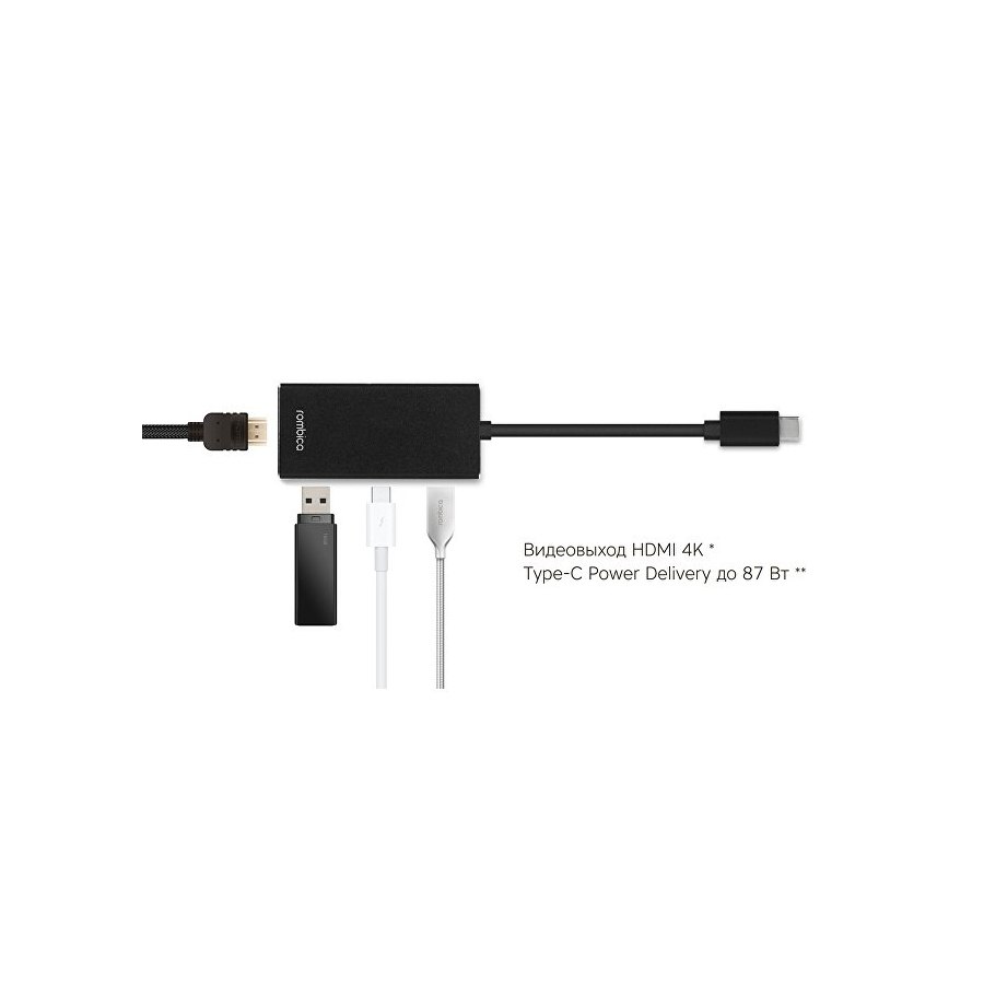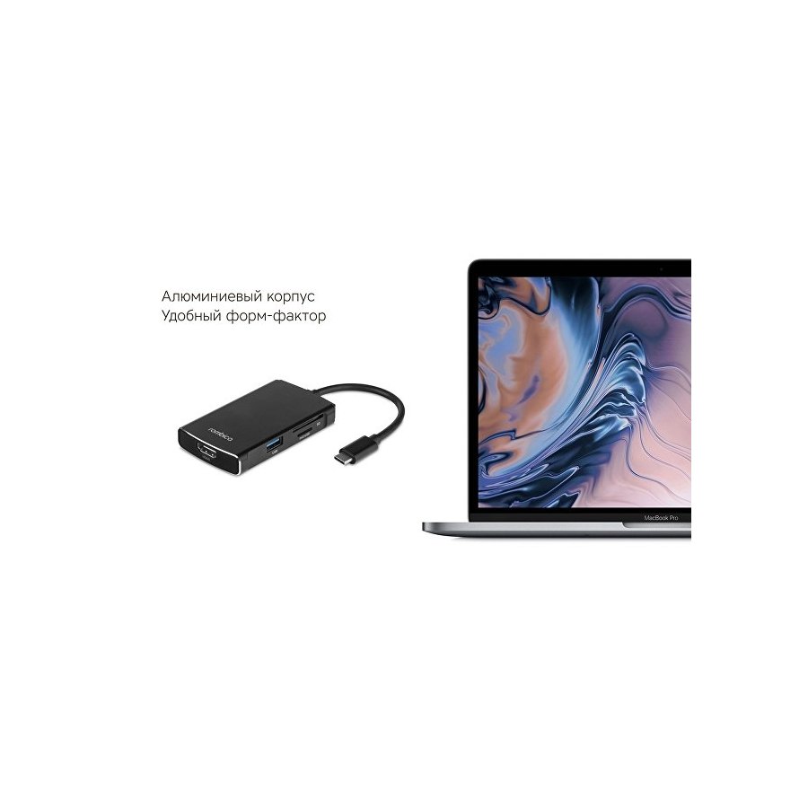• Для ноутбуков с интерфейсом USB Type-C • 3 высокоскоростных порта USB 3.0 • Видеовыход HDMI 4K * • Type-C Power Delivery до 87 Вт ** • Картридер для microSDXC и SDXC карт памяти • Не требует дополнительного питания • Алюминиевый корпус • Удобный форм-фактор * Для работы видеовыхода требуется поддержка Alternate Mode (альтернативный режим) на Type-C порту ноутбука, к которому подключен адаптер. ** Для зарядки ноутбука через порт док-станции Type-C требуется использовать штатное зарядное устройство для ноутбука (в комплект устройства не входит). Ноутбук должен поддерживать зарядку через порт USB Type-C Female, к которому подключен адаптер. Коннектор для подключения к компьютеру: USB 3.0 Type-C Интерфейсы: • USB Type-C Power Delivery до 87 Вт • HDMI видеовыход 4К@30Гц, 1080p@60Гц • 3 x USB 3.0 Type-A SuperSpeed • Слот SDXC • Слот microSDXC Совместимость с ОС: Windows 8.1/10, macOS 10.10 - 10.1x Рабочее напряжение: 5В Питание: от Type-C порта (пассивное) Максимальная мощность PD: 87 Вт Размеры: 225 x 50 x 12 мм Вес:81± 5 г