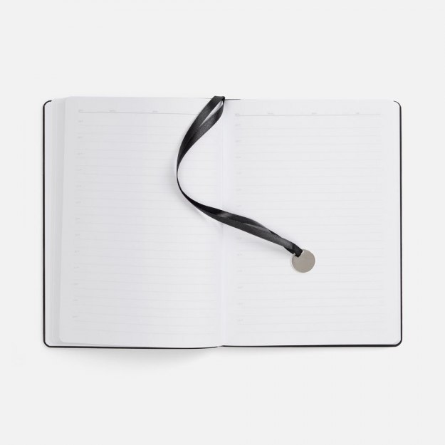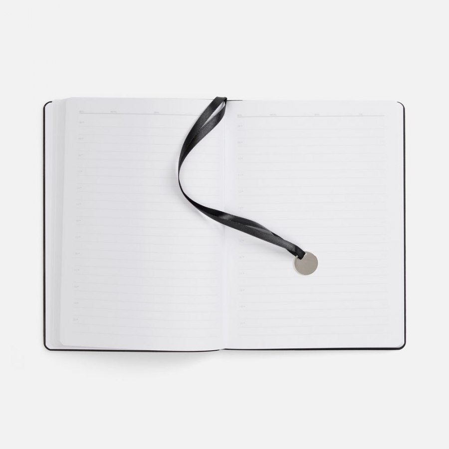 Ежедневник с гибкой обложкой, выполнен из материала La Fite, черный АА, дополнен ляссе в цвет обложки с металлическим шильдом.