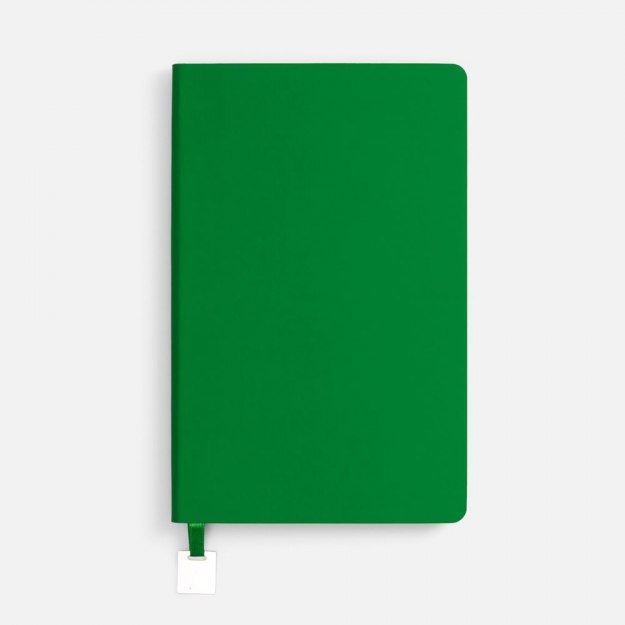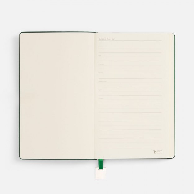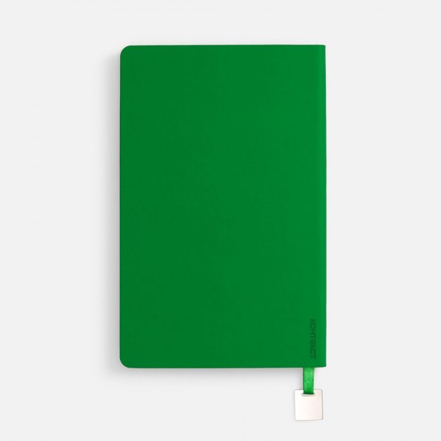 Ежедневник с гибкой обложкой, выполнен из материалов Soft Touch Ultra, зеленый FF, и Latte, зеленй (внутренняя часть обложки), дополнен ляссе в цвет обложки и металлической шильдой.