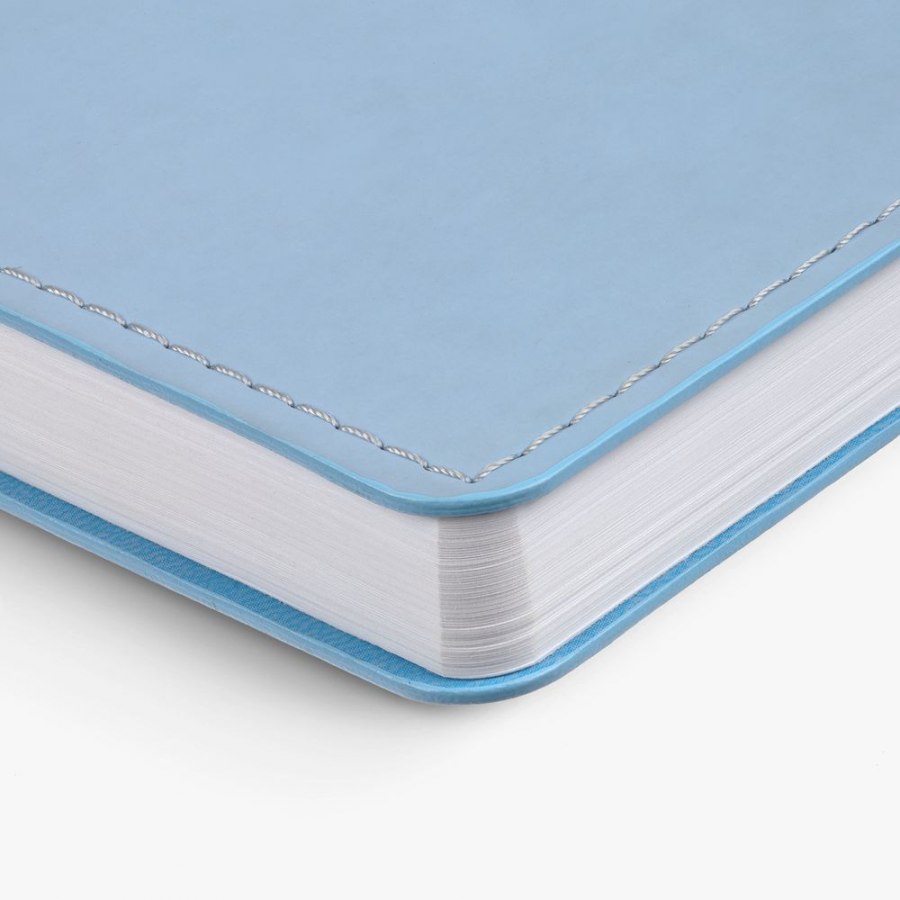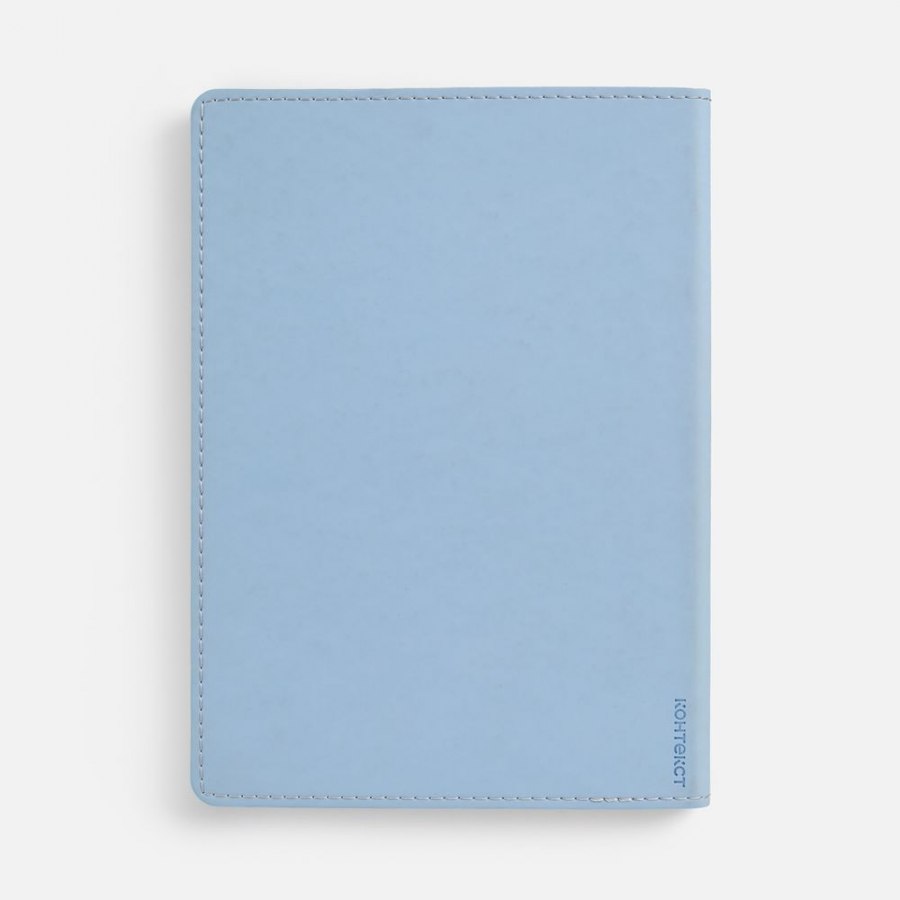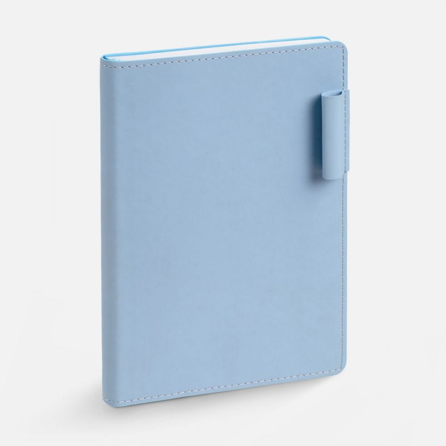 Ежедневник с гибкой обложкой из материала Soft Touch, голубой и Latte, голубой, дополнен петелькой для ручки из покровного материала, капталом, ляссе и закрашенным срезом обложки в цвет материала.