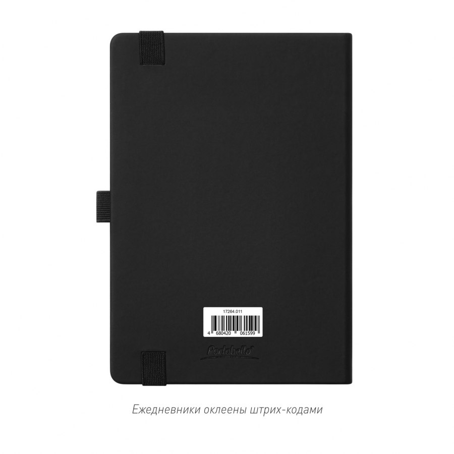 Недатированный ежедневник выполнен в жесткой обложке из искусственной кожи со скругленными уголками. Переплетный материал Soft Touch гладкий, матовый, однородный, с эффектом пудры. Цвет – классический черный. Страницы светло-кремового оттенка создают контраст с цветовым решением обложки. Выполнены из гладкого офсета, шелковистые, комфортны и приятны руке. Имеют скругленные уголки. Форзац и нахзац кремовые в тон страниц.. Срез матовый, в тон страниц. Одинарное атласное ляссе черного цвета шириной 6 мм, с легким блеском. Фиксирующая резинка плотная, черного цвета, декорирована прямоугольным фрагментом из материала обложки с прошивкой в тон. Петелька для ручки в тон резинки. Упаковка: пластиковая коробка – есть.