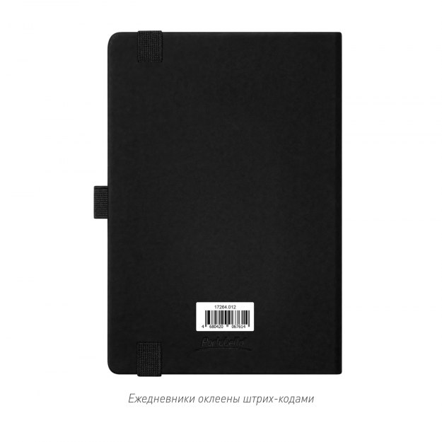 Недатированный ежедневник выполнен в жесткой обложке из искусственной кожи со скругленными уголками. Переплетный материал Soft Touch гладкий, матовый, однородный, с эффектом пудры. Цвет – классический черный. Страницы светло-кремового оттенка создают контраст с цветовым решением обложки. Выполнены из гладкого офсета, шелковистые, комфортны и приятны руке. Имеют скругленные уголки. Форзац и нахзац черные в цвет обложки. Срез матовый, в тон страниц. Одинарное атласное ляссе черного цвета шириной 6 мм, с легким блеском. Фиксирующая резинка плотная, черного цвета, декорирована прямоугольным фрагментом из материала обложки с прошивкой в тон. Петелька для ручки в тон резинки. Упаковка: пластиковая коробка – есть.