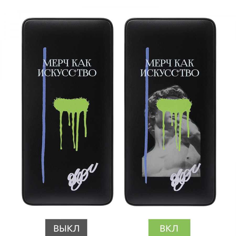 Особенность данного внешнего аккумулятора - инновационный вид персонализации: скрытая цветная УФ-печать логотипа заказчика, которая видна только при включении аккумулятора. (*Ввиду технологических особенностей конструкции устройства и метода нанесения, отгрузка данного аккумулятора возможна только с персонализацией!)