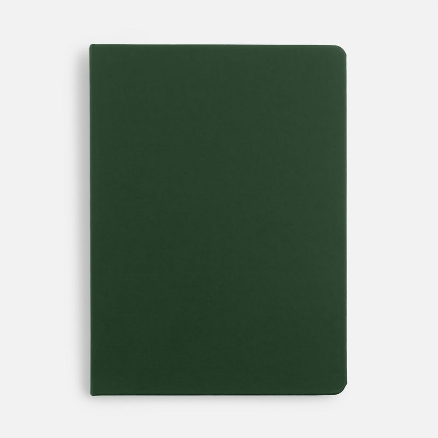 Ежедневник с твердой обложкой и тонированным обрезом, выполнен из материала Soft Touch, зеленый FF, дополнен ляссе в цвет обложки.
