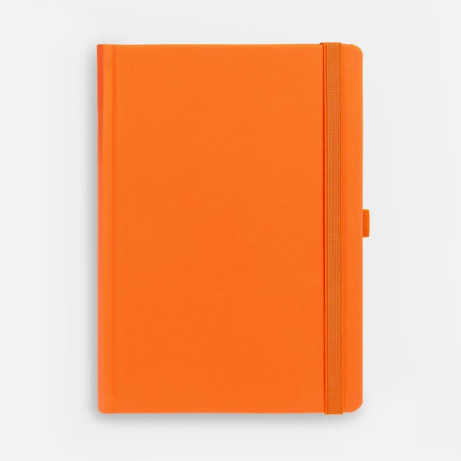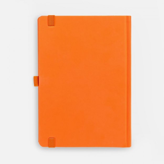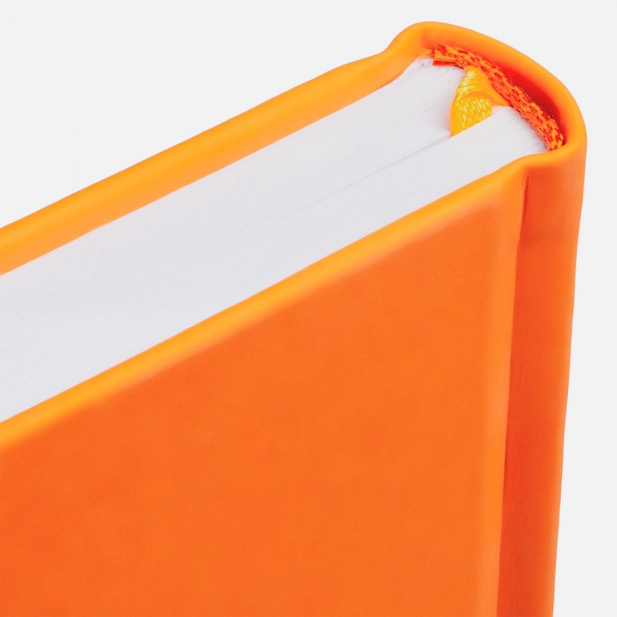 Ежедневник с твердой обложкой без поролона, выполнен из материала Soft Touch, оранжевый ОО, дополнен резинкой шириной 1 см, петлей-резинкой для ручки, капталом и ляссе оранжевого цвета.