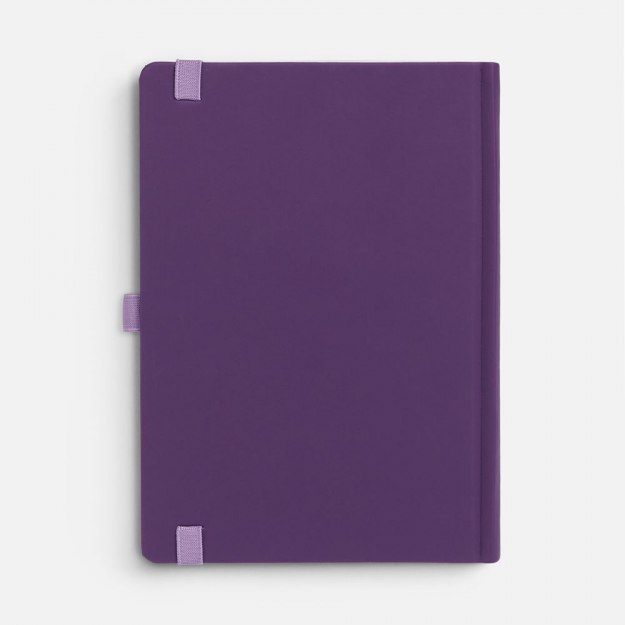Ежедневник с твердой обложкой без поролона, выполнен из материала Soft Touch, фиолетовый UU, дополнен резинкой шириной 1 см, петлей-резинкой для ручки, капталом и ляссе в цвет обложки.