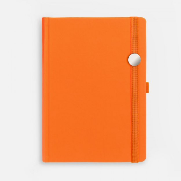 Ежедневник с твердой обложкой без поролона, выполнен из материала Soft Touch, оранжевый ОО, дополнен резинкой шириной 1 см, петлей-резинкой для ручки, капталом и ляссе оранжевого цвета.