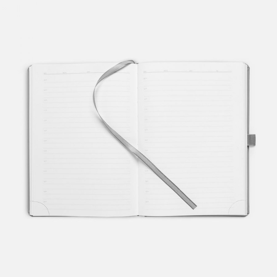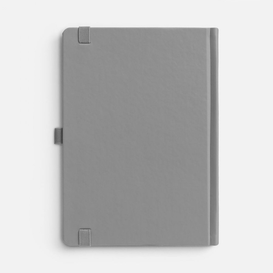 Ежедневник с твердой обложкой без поролона, выполнен из материала Soft Touch, серый СС, дополнен резинкой шириной 1 см, петлей-резинкой для ручки, капталом и ляссе серого цвета.
