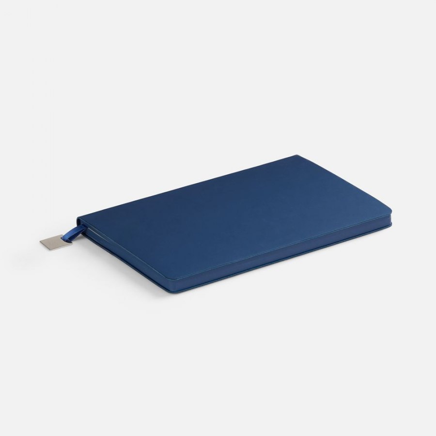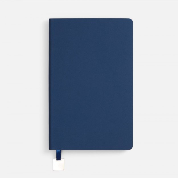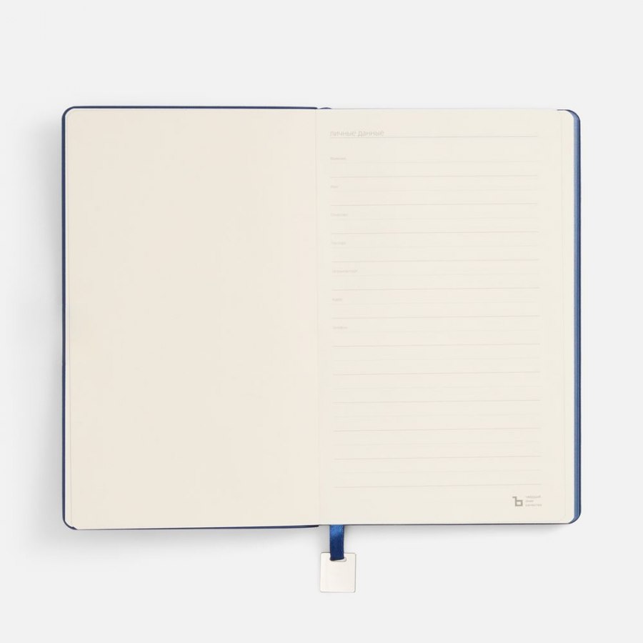 Ежедневник с гибкой обложкой, выполнен из материалов Soft Touch Pearl, синий НН, и темно-синего Latte (внутренняя часть обложки), дополнен ляссе в цвет обложки и металлической шильдой..