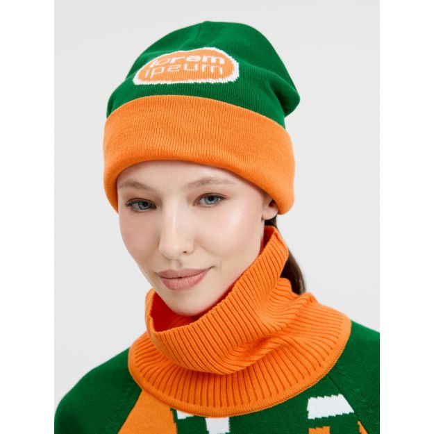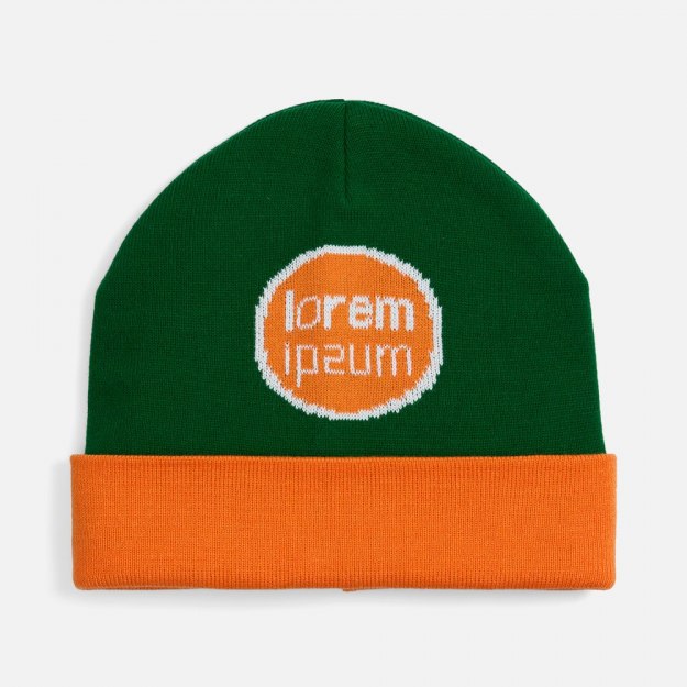 Шапка с вывязанным логотипом и индивидуальным рисунком в фирменной цветовой гамме.