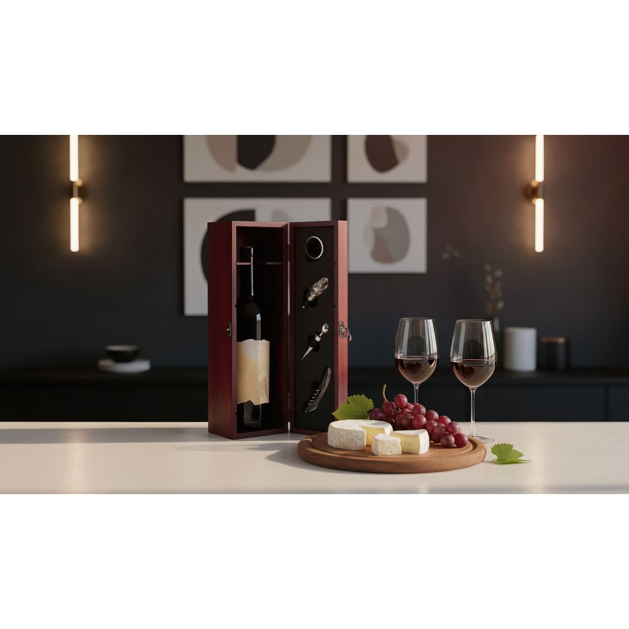 Готовый сет представлен в лаконичном деревянном футляре. Бутылка отличного вина в подарок достойна красивого оформления!