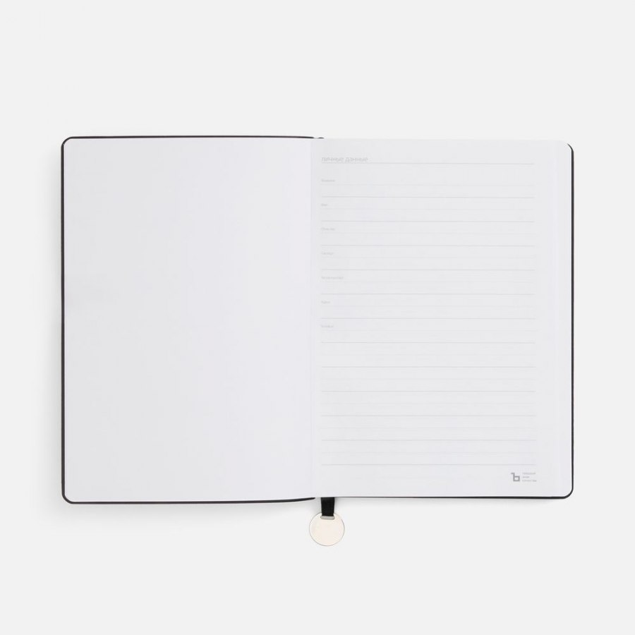 Ежедневник с гибкой обложкой, выполнен из материала La Fite, черный АА, дополнен ляссе в цвет обложки с металлическим шильдом.