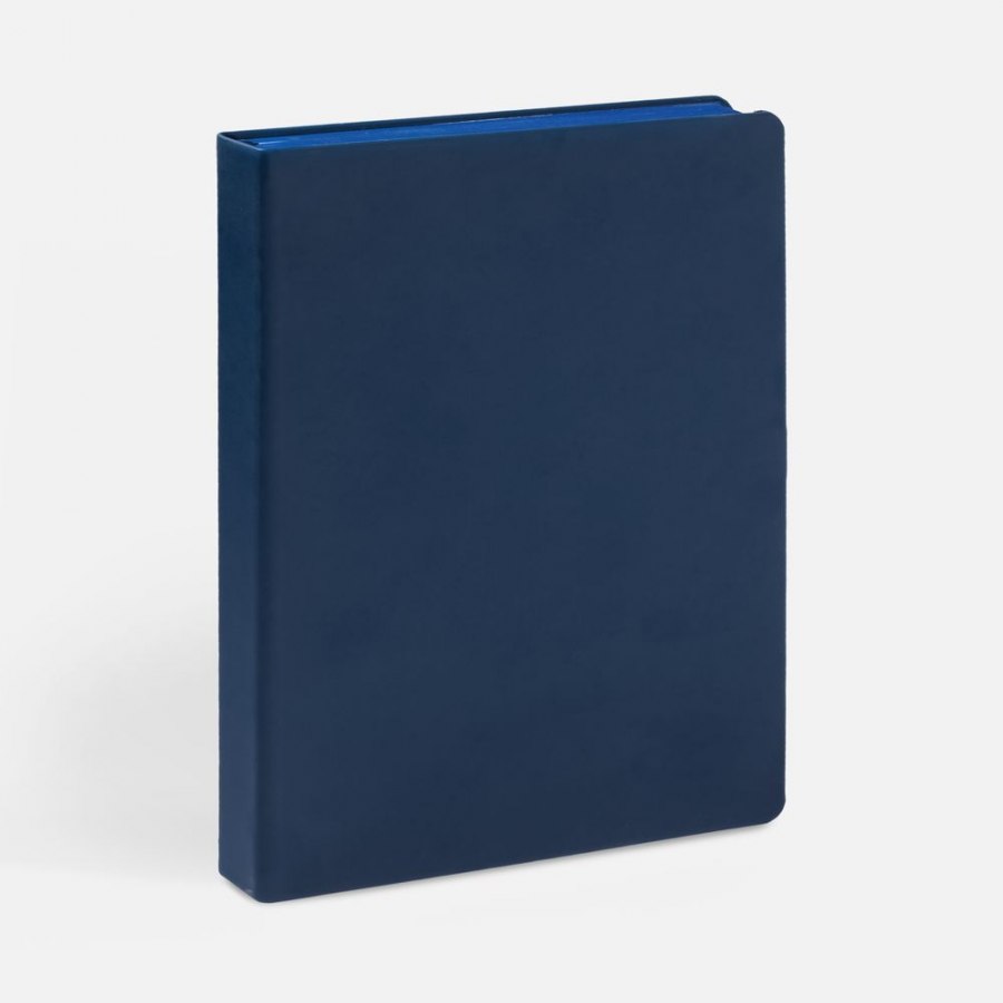Ежедневник с твердой обложкой и тонированным обрезом, выполнен из материала Soft Touch, синий НН, дополнен ляссе в цвет обложки.