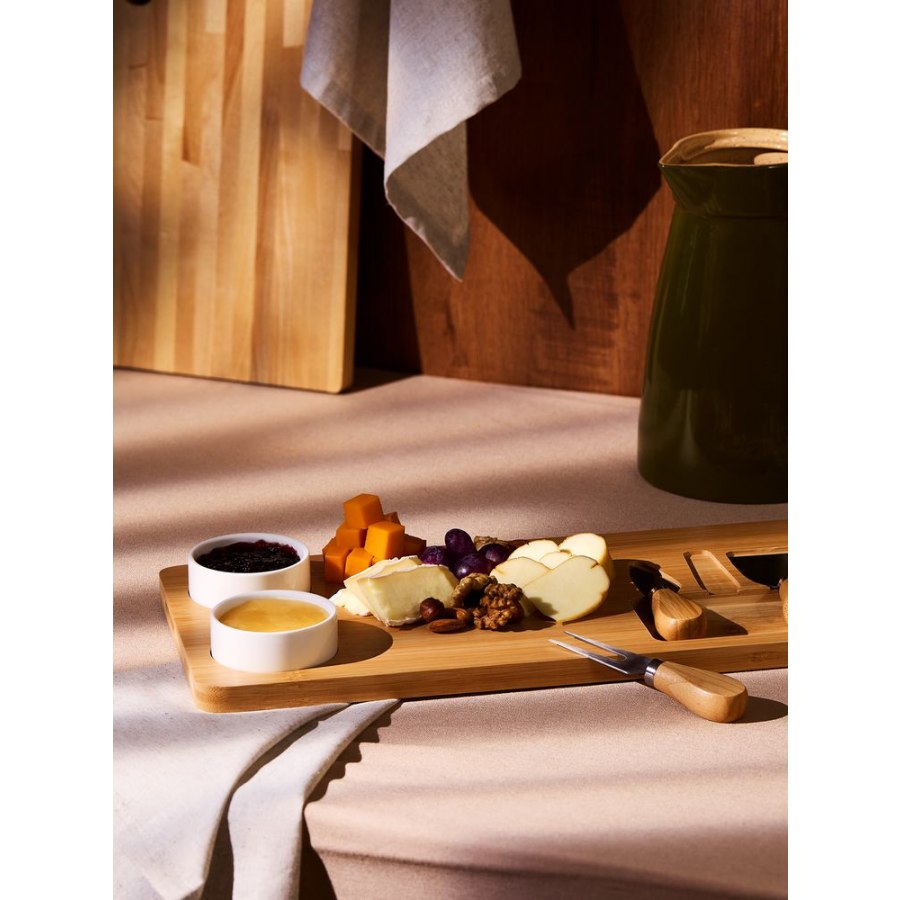 В набор входят доска из бамбука, два керамических соусника, вилка, листовидный нож для сыра твердых сортов, нож-лопатка для мягкого сыра.