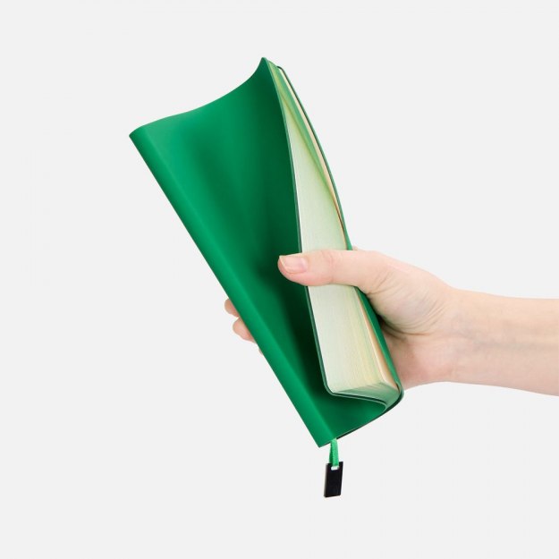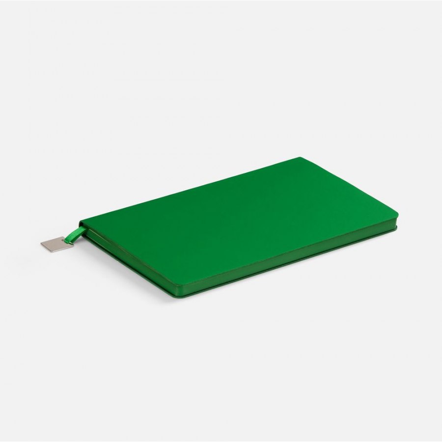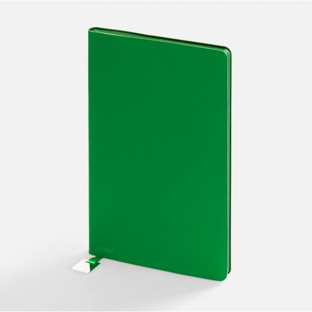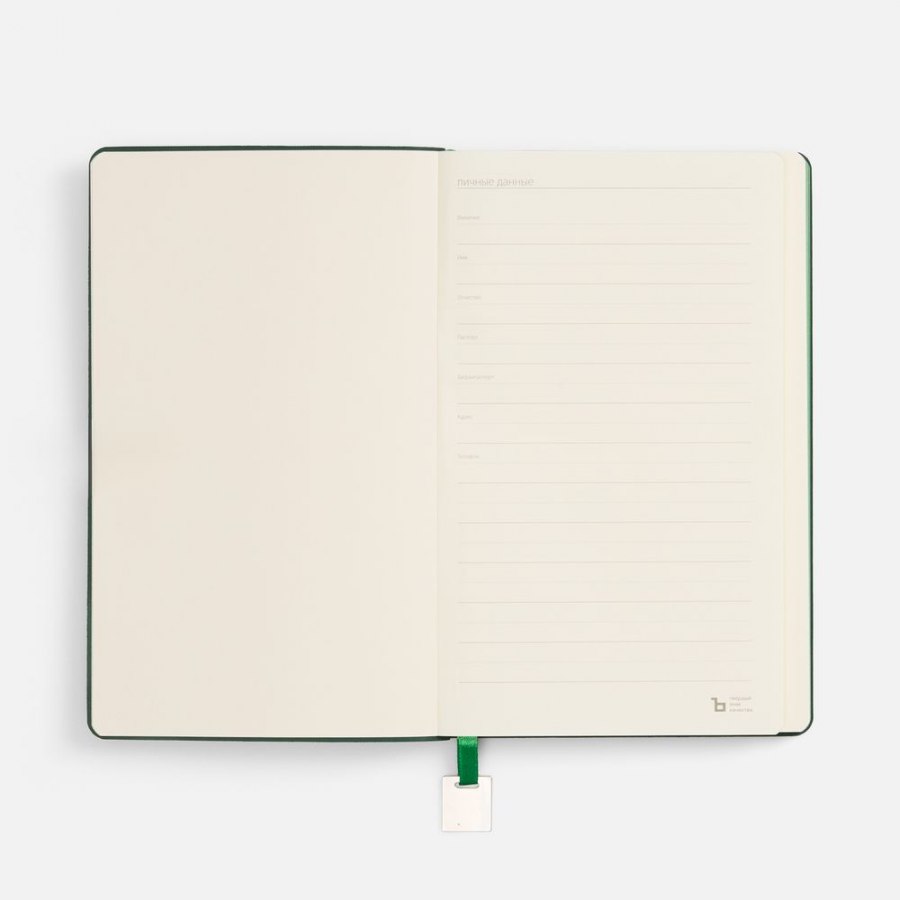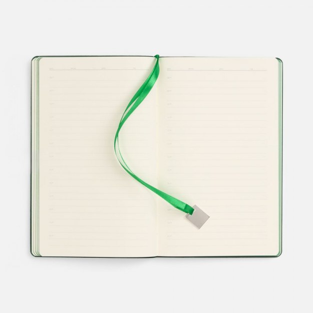 Ежедневник с гибкой обложкой, выполнен из материалов Soft Touch Ultra, зеленый FF, и Latte, зеленй (внутренняя часть обложки), дополнен ляссе в цвет обложки и металлической шильдой.