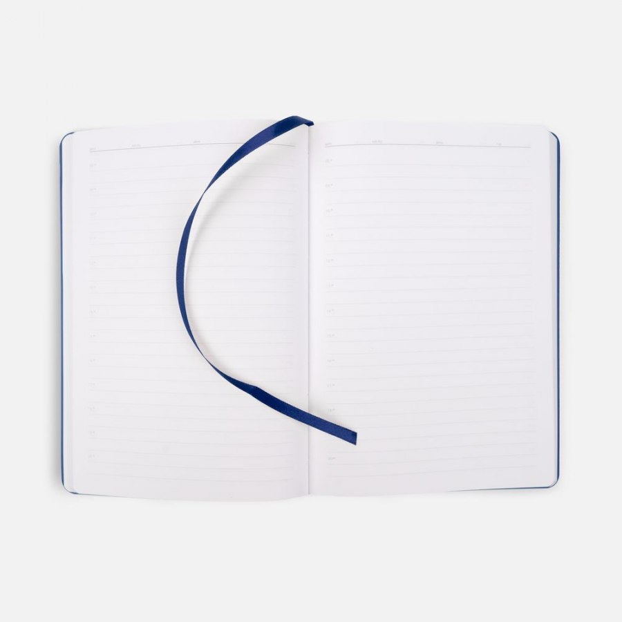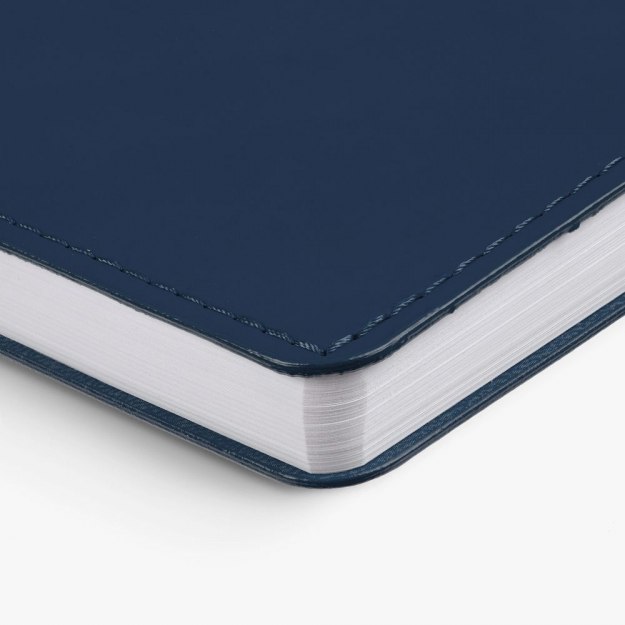Ежедневник с гибкой обложкой из материала Soft Touch, синий НН и Latte, темно-синий, дополнен петелькой для ручки из покровного материала, капталом, ляссе и закрашенным срезом обложки в цвет материала. Блок 985, без календарной сетки: