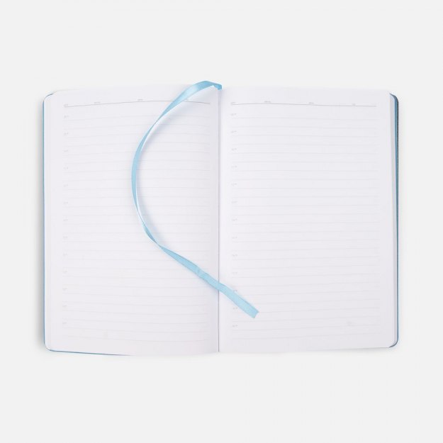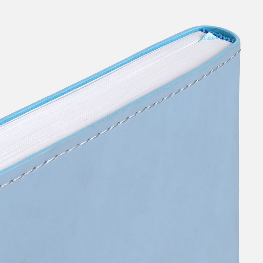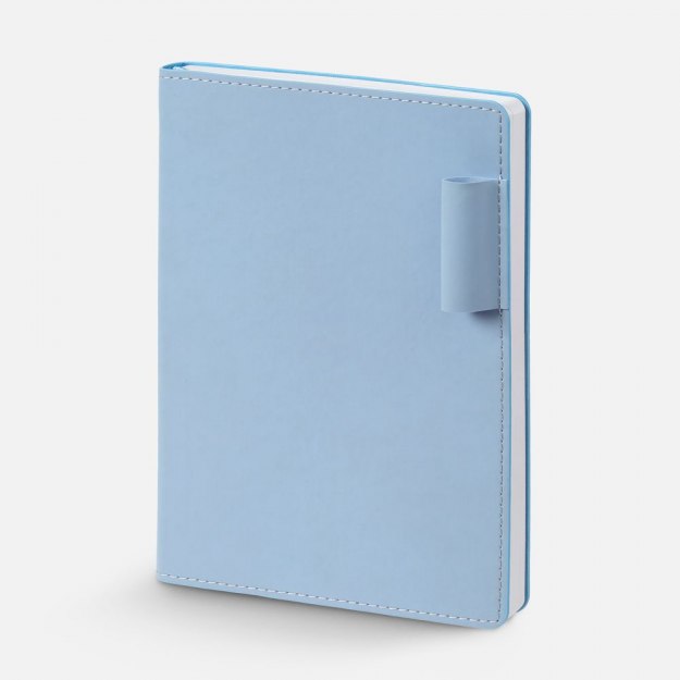 Ежедневник с гибкой обложкой из материала Soft Touch, голубой и Latte, голубой, дополнен петелькой для ручки из покровного материала, капталом, ляссе и закрашенным срезом обложки в цвет материала.