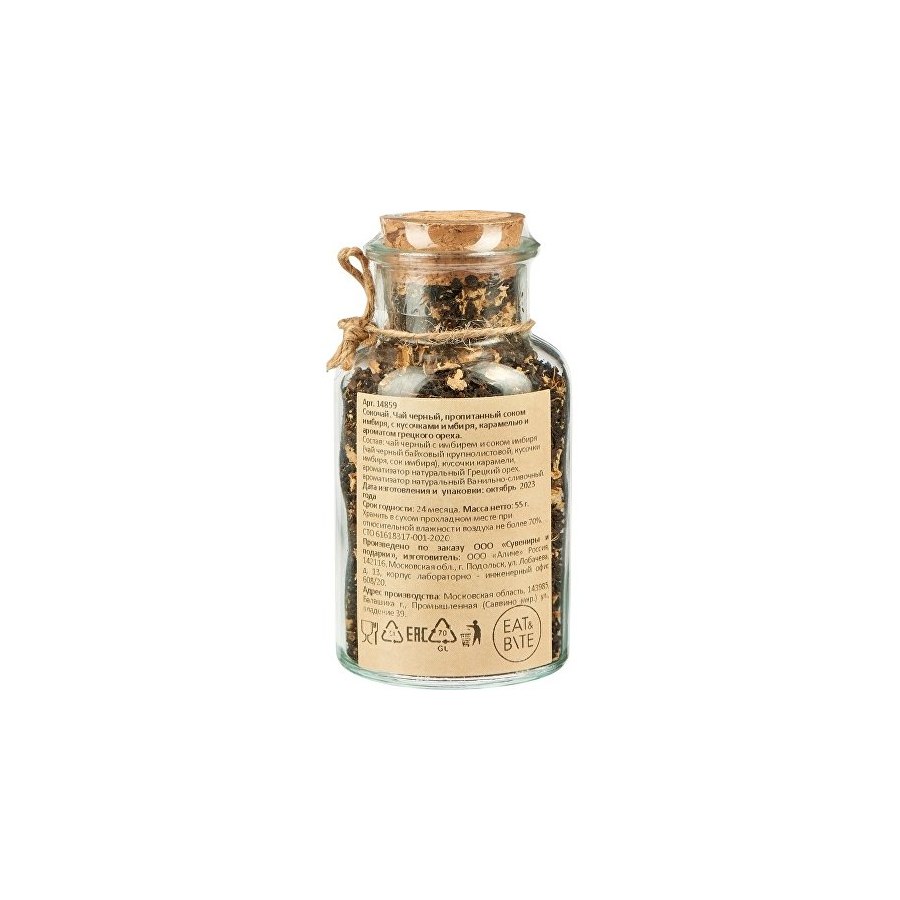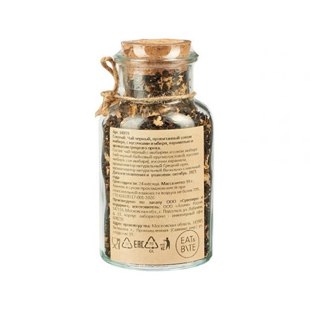 Состав: чай черный байховый крупнолистовой, кусочки имбиря, сок имбиря, кусочки карамели, ароматизаторы натуральные Грецкий орех и Ванильно-сливочный
