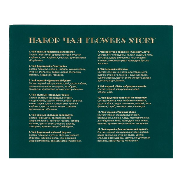 Разные времена года — разные сорта чая! Именно по такому принципу создан набор Flowers Story. Это настоящий чайный календарь: на каждый месяц предусмотрен особый вид тонизирующего насыщенного напитка. Открывайте нужное «окошко» по времени года или по настроению — и окунитесь в атмосферу цветущей весны, жаркого лета, расслабленной осени или волшебной зимы!