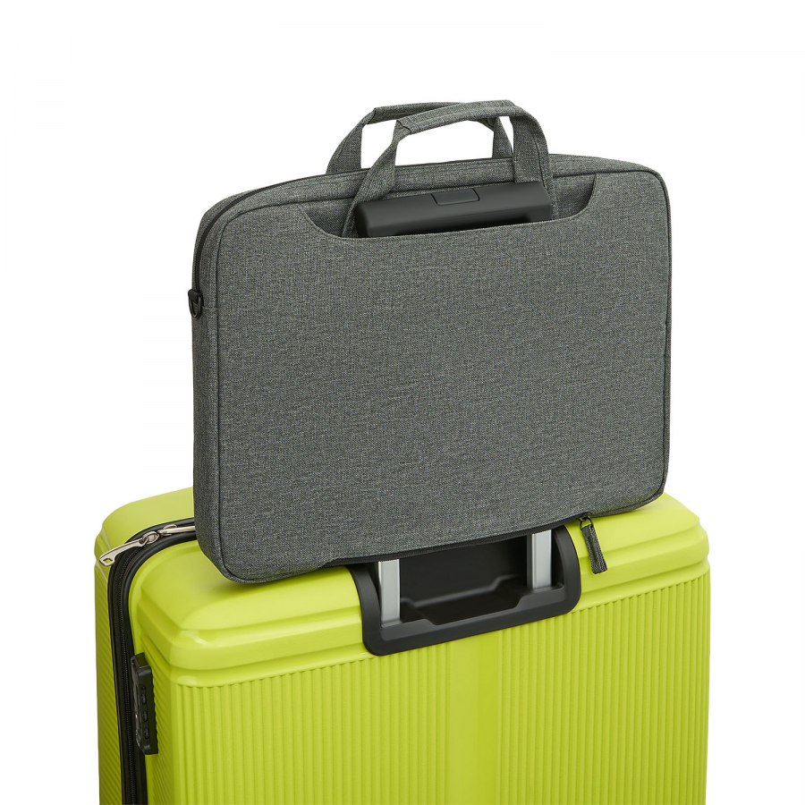 С внешней внутренней стороны общее отделение на липучке, которое можно использовать как дополнительное отделение для бумаг, либо открыть молнию внизу и одевать на выдвижную ручку вашего чемодана.