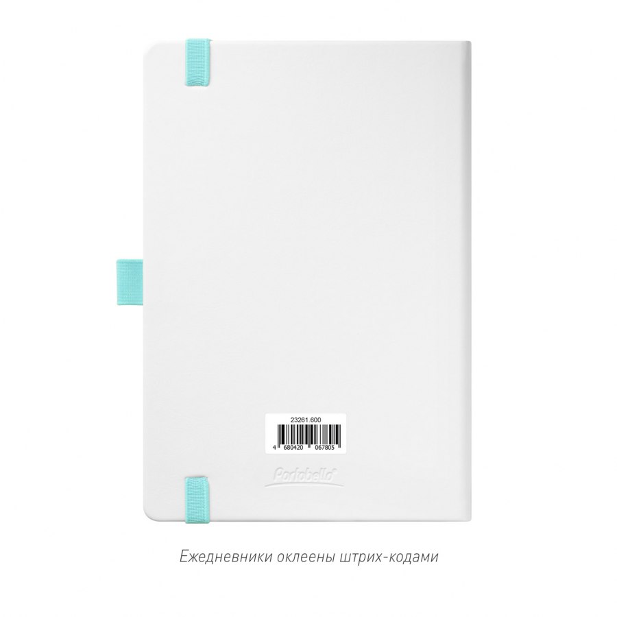Недатированный ежедневник выполнен в жесткой обложке из искусственной кожи со скругленными уголками. Переплетный материал гладкий, с легкой естественной паутинкой морщин, имеет полуглянцевый блеск. Цвет – чистый белый. Бирюзовые матовые форзац и нахзац, а также бирюзовый срез блока создают оригинальный динамичный цветовой ансамбль и подчеркивают белизну обложки. Страницы светло-кремового цвета, из гладкого офсета, слегка шелковистые, со скругленными уголками. Добавляют изделию мягкую комфортную теплоту. Двойное атласное ляссе составлено из бирюзовой и белой лент. Каждая шириной 6 мм, имеет легкий блеск. Вертикальная фиксирующая резинка прочная, надежная и удобная, в тон срезу. Есть петелька для ручки в тон резинки. Карман на заднем форзаце.