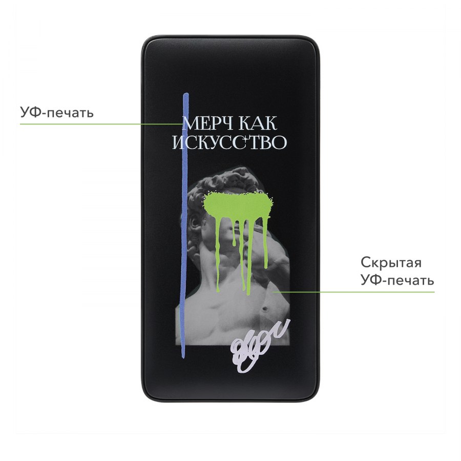 Особенность данного внешнего аккумулятора - инновационный вид персонализации: скрытая цветная УФ-печать логотипа заказчика, которая видна только при включении аккумулятора. (*Ввиду технологических особенностей конструкции устройства и метода нанесения, отгрузка данного аккумулятора возможна только с персонализацией!)