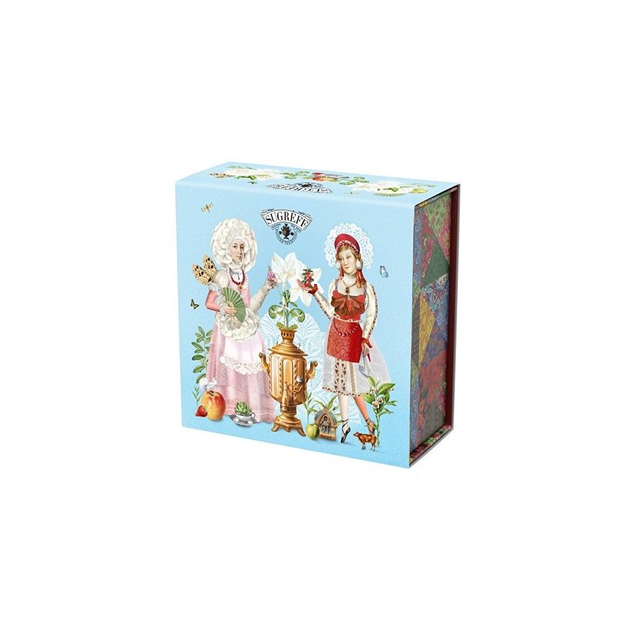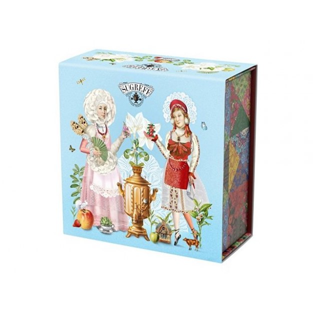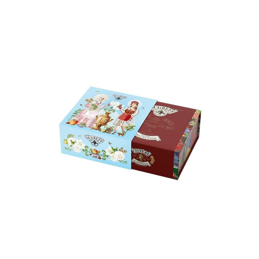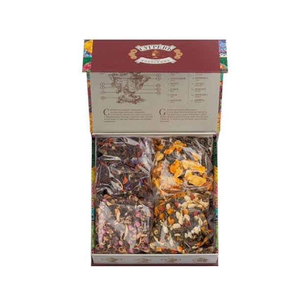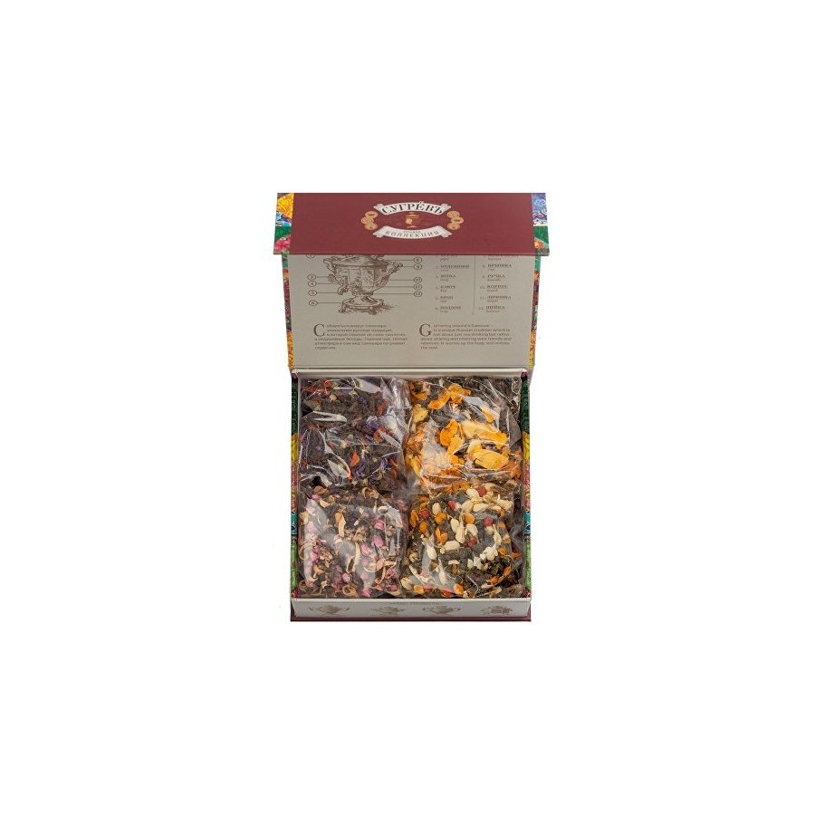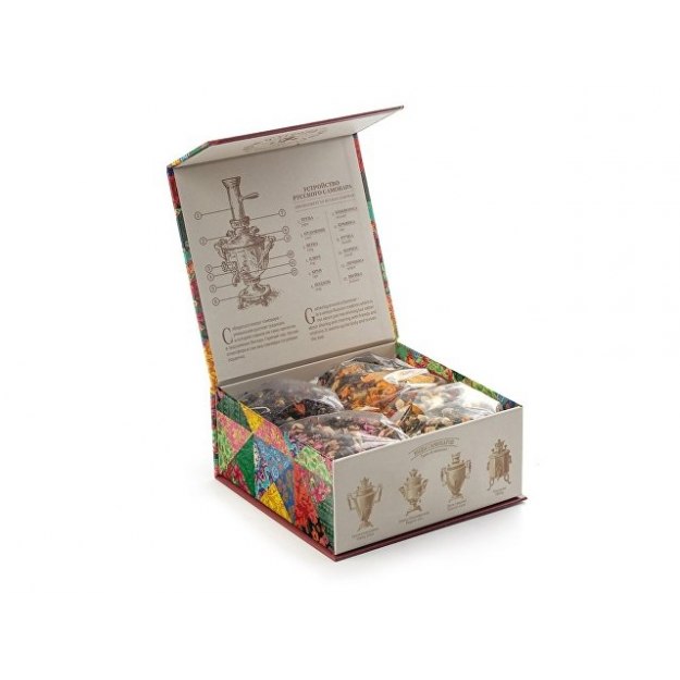 Купажи чая составлены так, чтобы сочетать вкус и аромат отборных сортов китайского и индийского чай с красотой разноцветных лепестков календулы, мальвы, цветов яблони, жасмина, акации и других. Внутри шкатулки находится мини-открытка, которую покупатель может подписать. Состав: Купаж 1: чай зеленый китайский, купальница, цветки яблони, ароматизатор. Купаж 2: тегуань инь, цветы акации, цветы жасмина, ароматизатор. Купаж 3: чай черный индийский, цветы лилии, мальва, ароматизатор. Купаж 4: чай черный индийский ,цветы персика, цветки апельсинового дерева, ароматизатор.
