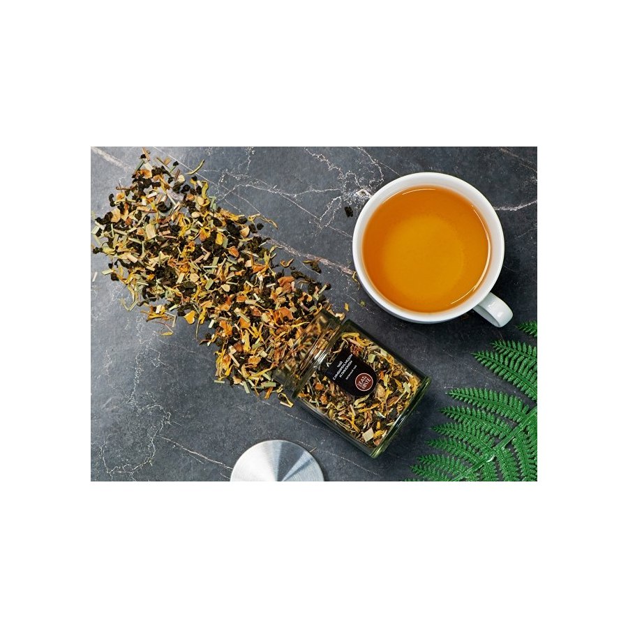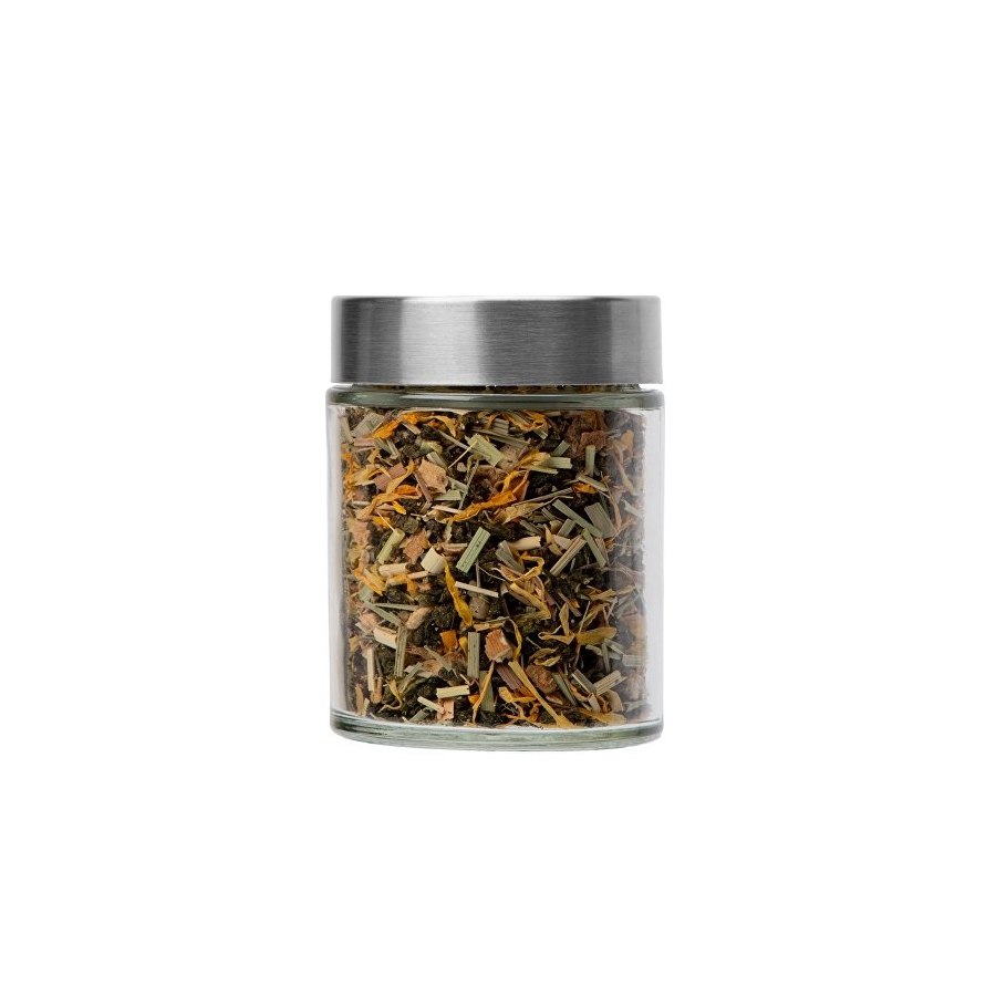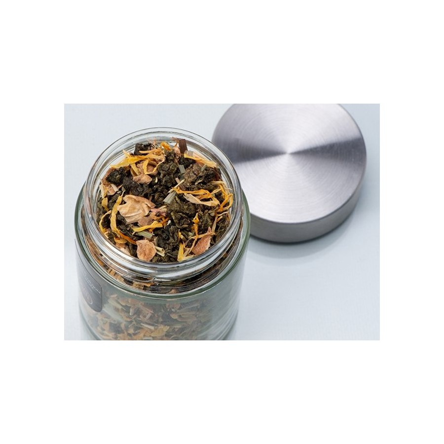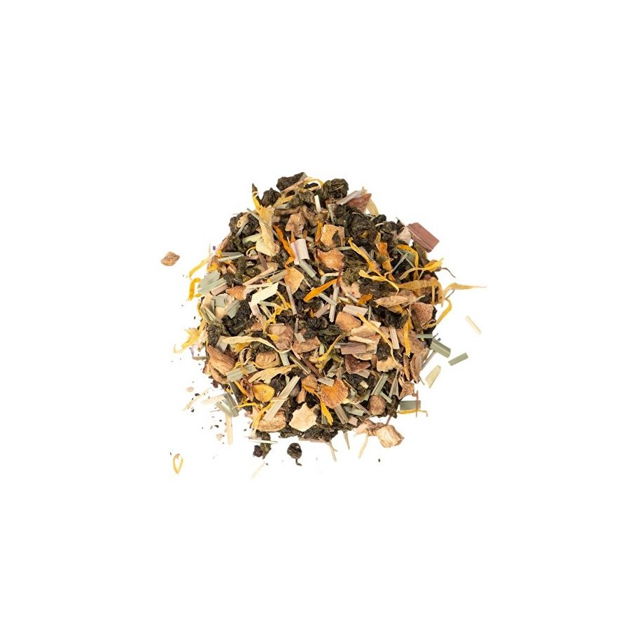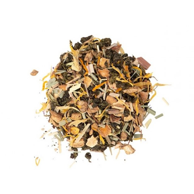 Состав: китайский чай Тегуаньинь, имбирь, цедра лимона, лимонная трава, медовые гранулы, лепестки календулы