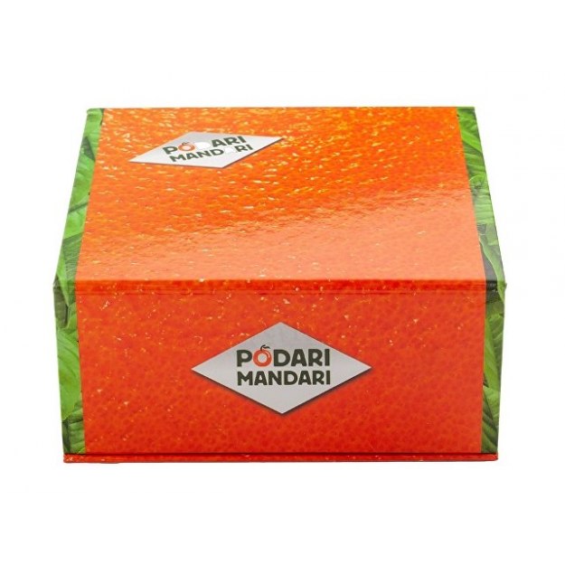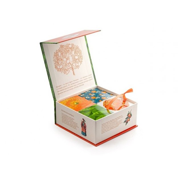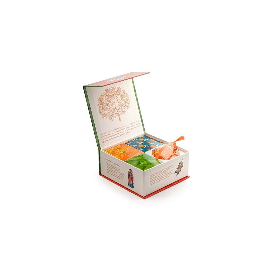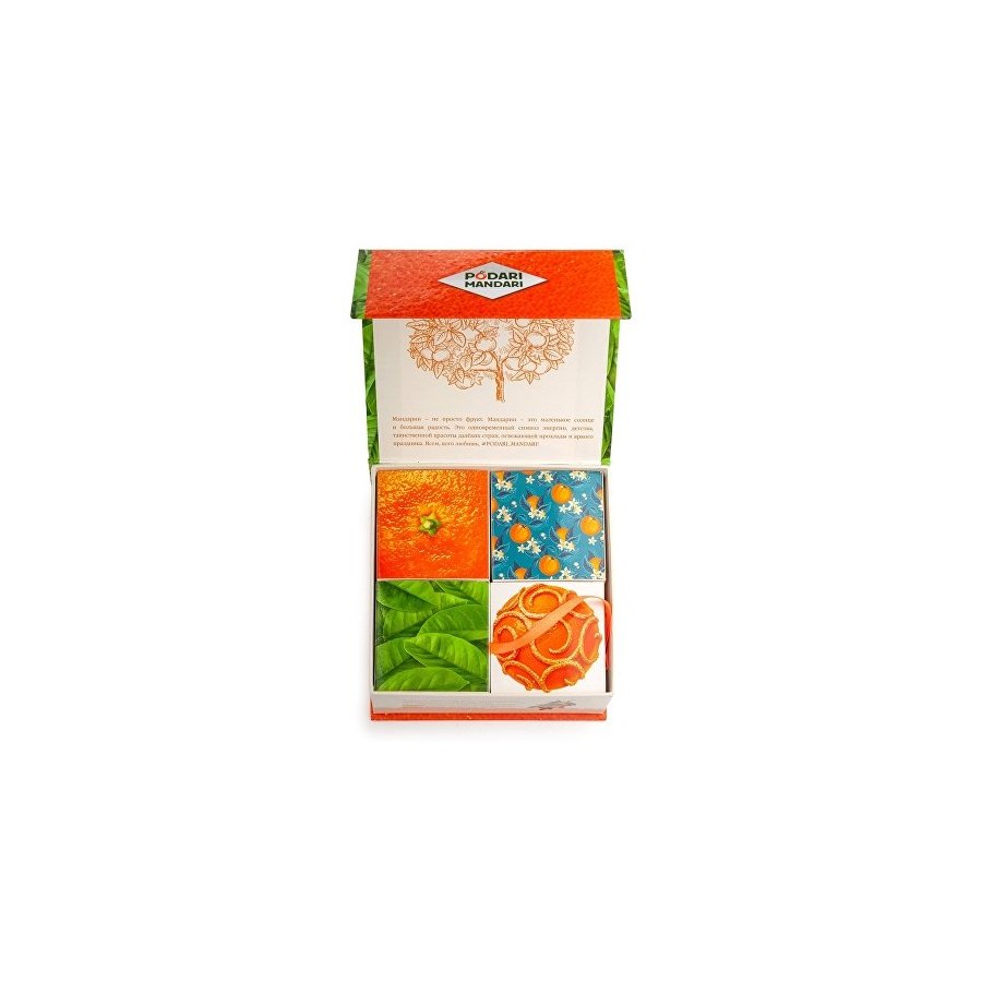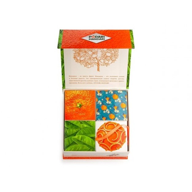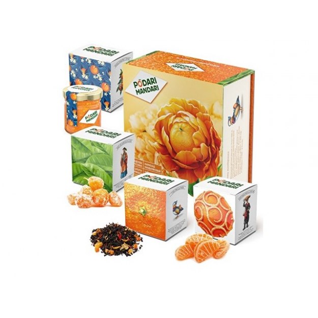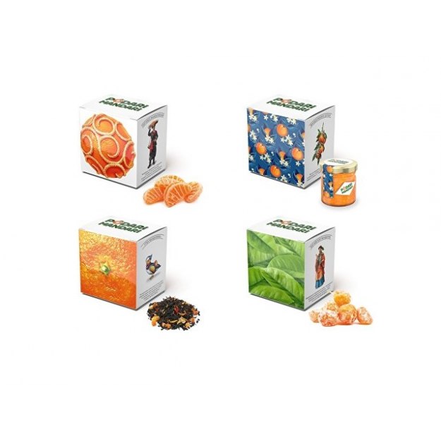 Гастрономический подарочный набор ПодариМандари. Набор представляет собой метафору мандарина – одного из главных символов Нового года. Состоит из 4 продуктов: – чай с цедрой, сегментами и цветами апельсина; – мармелад из мандаринов; – цукаты из кумквата; – цитрусовые леденцы. Продукты упакованы в небольшие картонные коробочки размером 70 х 70 х 55 мм и помещены в шкатулку из переплётного картона с магнитным клапаном. Состав: Кумкват: кумкват, сахар, Е220. Мармелад: сахар, мандариновое пюре, патока, лимонная кислота, пектин. Чай: чай черный байховый, лепестки календулы, ягоды облепихи, имбирь, кусочки апельсина, шелковица. Леденцы: патока, вода, регуляторы кислотности (лимонная кислота, молочная кислота), ароматизаторы, идентичные натуральным, краситель: аннато, сахар.